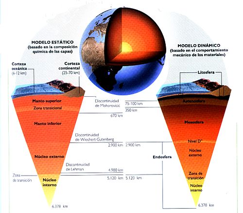 La corteza y la parte superior fría y rígida del manto superior se conocen comúnmente como la litosfera, y es de la litosfera de lo que están compuestas las placas tectónicas. Debajo de la litosfera se encuentra la astenosfera, una capa de relativamente baja viscosidad sobre la que flota la litosfera. Dentro del manto, entre los 410 y 660 km bajo la superficie, se producen importantes cambios en la estructura cristalina. Estos cambios generan una zona de transición que separa la parte superior e inferior del manto. Bajo el manto se encuentra un núcleo externo líquido de viscosidad extremadamente baja, descansando sobre un núcleo interno sólido. El núcleo interno puede girar con unavelocidad angular ligeramente superior que el resto del planeta, avanzando de 0,1 a 0,5° por año.